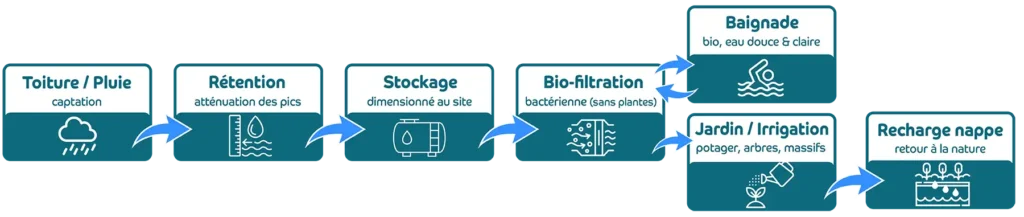 • Eau : si votre maison capte et stocke la pluie, O bioPool réutilise l’eau (arrosage, etc.) puis restitue à la nappe – Chaque goutte vit plusieurs vies.