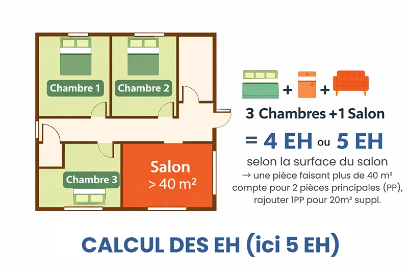 Par exemple, une maison comprenant 3 chambres et un séjour sera généralement dimensionnée pour 4 EH. Cette approche permet d’anticiper l’occupation maximale du logement, indépendamment du nombre réel d’occupants au quotidien.